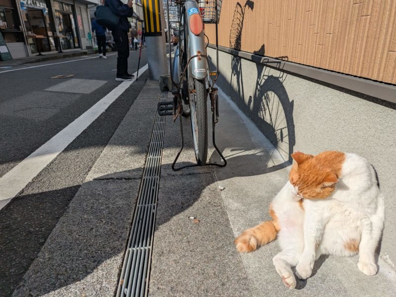 アーケード前で日向ぼっこするにゃんこ、お魚たくさんもらってるのかしらむっちりおっきく育ってます