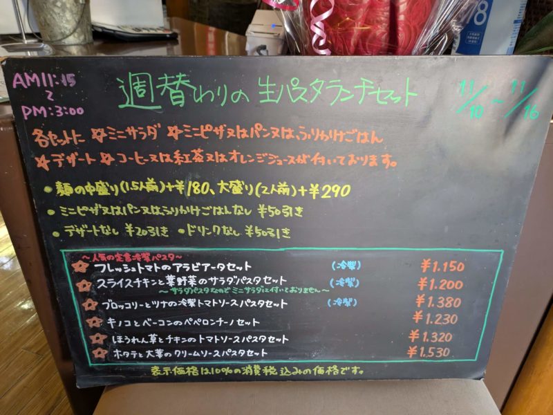 週替わりの生パスタランチセットが掲示されてます、席には相変わらず大量のメニューがあって、全体的に少し値上がりしてたけど内容はほぼ変わらず