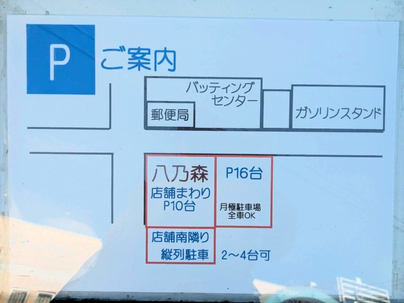 八乃森は駐車場が充実していて、店前のほか隣の広い駐車場、さらに少し手前(東)にも広い駐車場があり全部で30台停めることができます