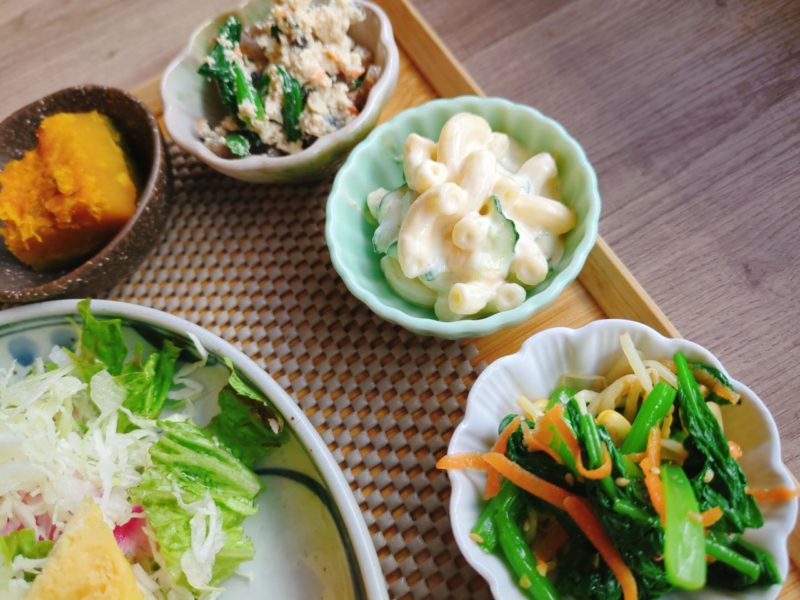 ほうれん草の白和え、マカロニサラダ、定番のツボを押さえた副菜ばかりね