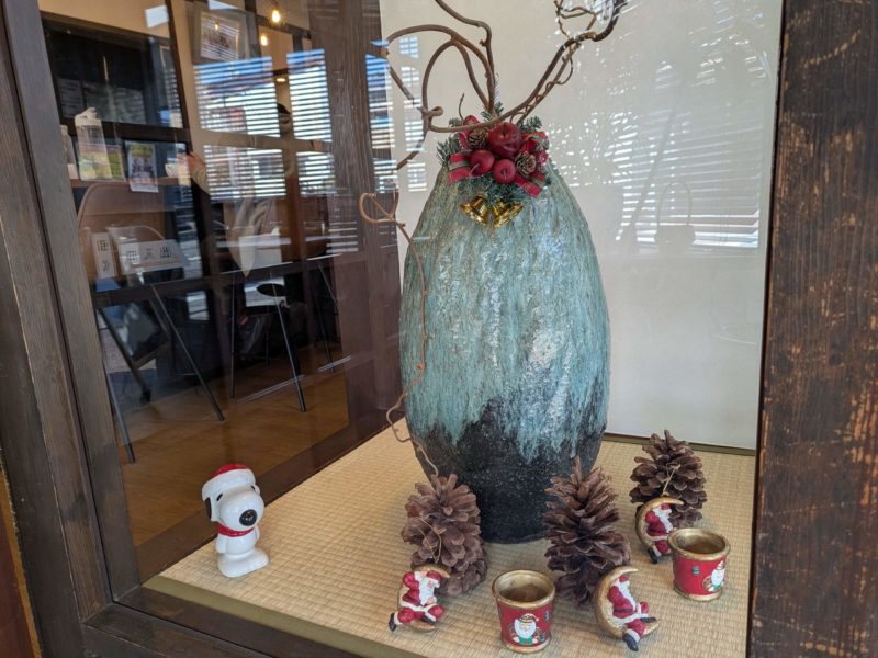 入口のショーケースには立派な花瓶とクリスマスグッズ