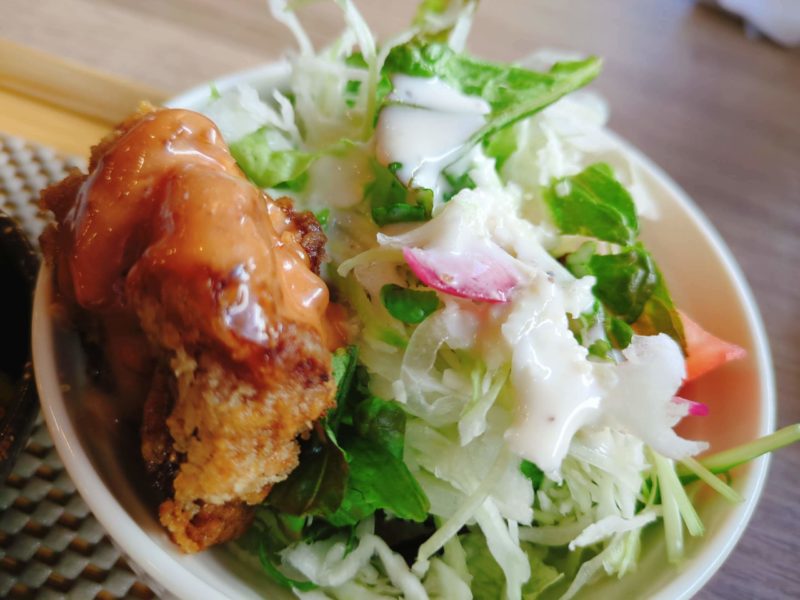 サラダに鶏唐揚げが1個付いてるのが嬉しい、オーロラソースかかってるからミニチキン南蛮やね