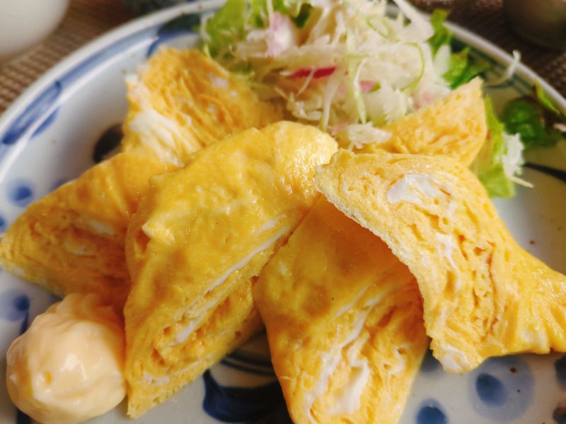 見るからにぷるんぷるんでおいしそうな卵焼き、マヨネーズが添えられてるのが居酒屋っぽい