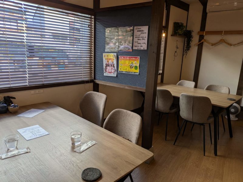 キッチン前のカウンター5席、奥には畳の座敷席が1卓あるらしいけど、既に店内お客さんがたくさんで写真は撮れず、店主さんにOKもらって人のいない瞬間にテーブル席だけパシャリ