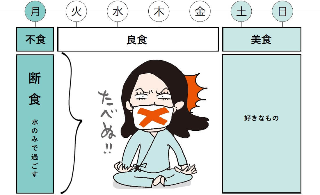 週1日、月曜日に何も食べず、〈良食→美食→断食〉のサイクルを繰り返すという、誰でもコスト0ですぐに取り組める超簡単な体質改善プログラムです。