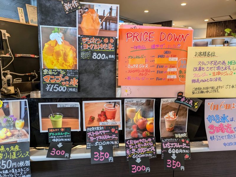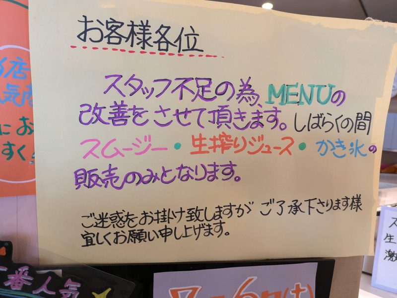 ここでも人手不足だそうです、店員さんたくさん居るけどすごく混雑してるから皆さん忙しそう、パフェは手間がかかるからお休みなのね