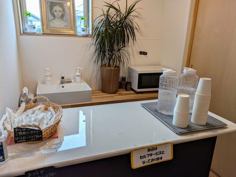 お水・おてふきございます、手洗い場と電子レンジもあり