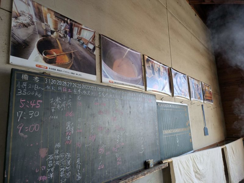大きな釜が3つ並んでます、手前の窯で絞ったばかりの汁を煮ていく1番窯