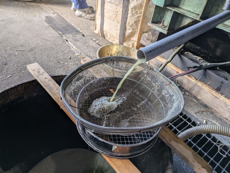 1番釜から2番釜へ移す前に一旦、煮釜より一回り小さい桶に入れて、不純物を沈殿させます
