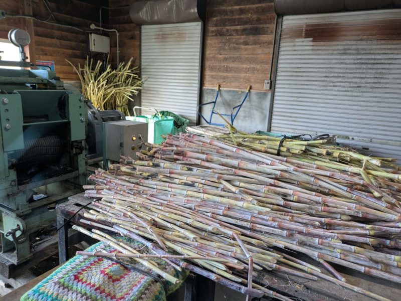 春に植え、夏の炎天下にがんばって草引きして11月の下旬から収穫、畑で葉っぱを落とされたサトウキビが伝承館の製糖場に運び込まれます