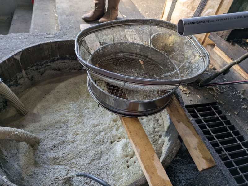 不純物を沈殿させた底の部分は入らないように、濾しながら上澄みを2番窯に入れてまた煮詰めていきます