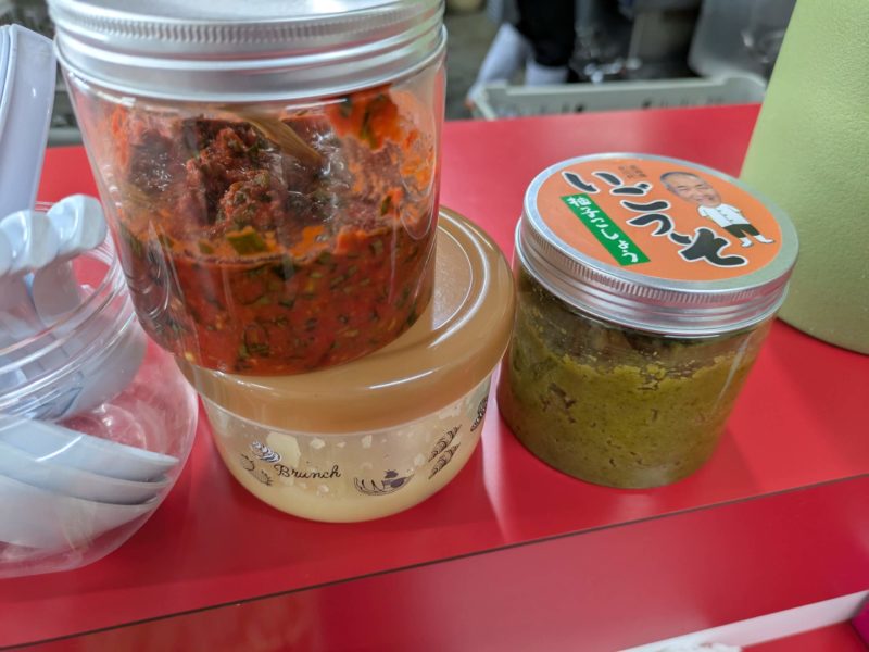 カウンターには手作りゆずコショーとニンニク、豆板醤