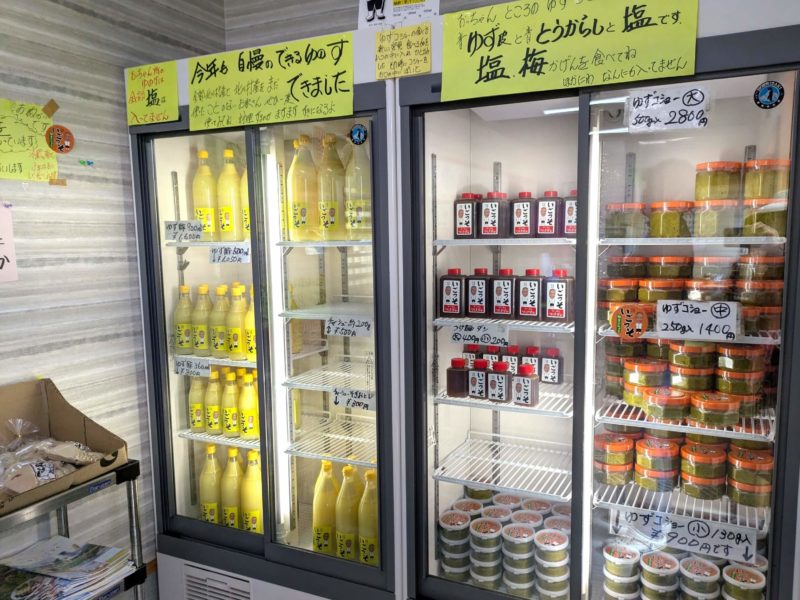入口の大きな冷蔵ケースにはオリジナルのゆずコショー、つけ麺の出汁、北側村の柚子をしぼった「ゆのす」