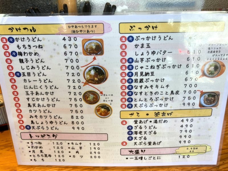 かけ、ぶっかけ、ざる、釜揚げ、冷かけがあるの嬉しいね、ひやあつ(麺ひや汁ある)もできるって、さすが讃岐スタイル