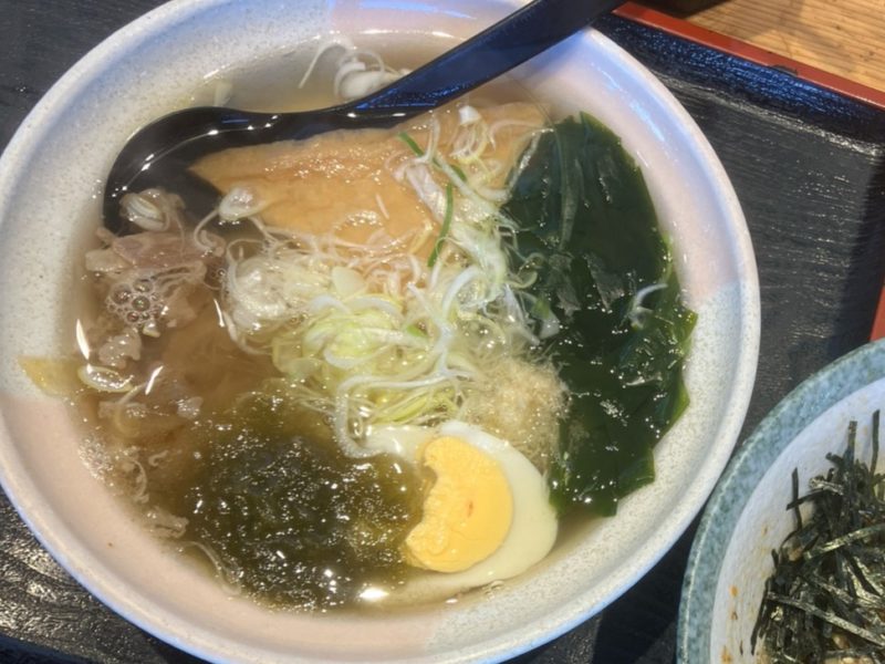 なんだかラーメンのような見た目だね、卵・わかめ・お揚げ・とろろ昆布・肉の五目