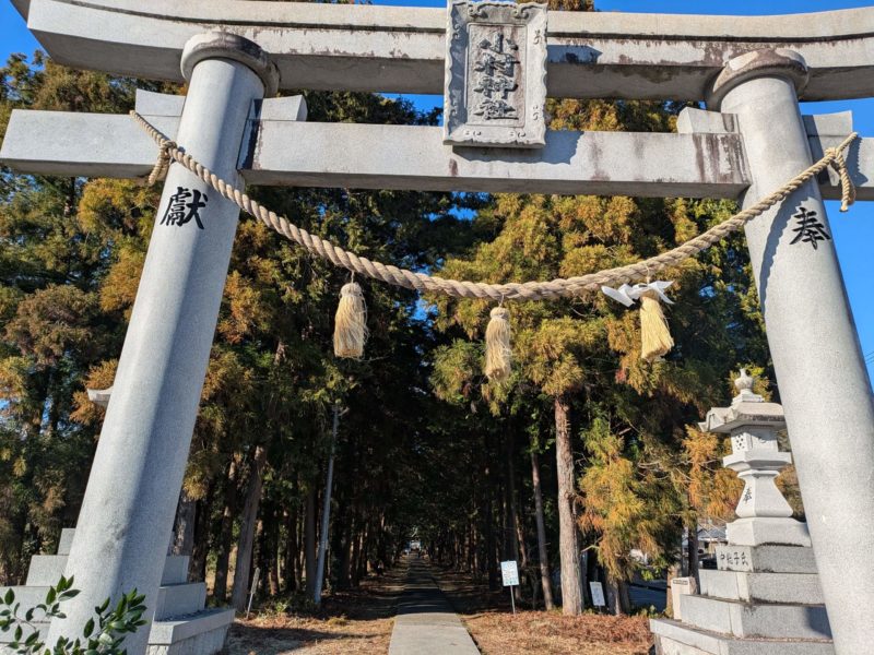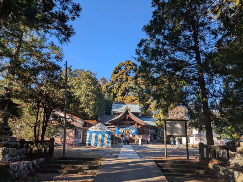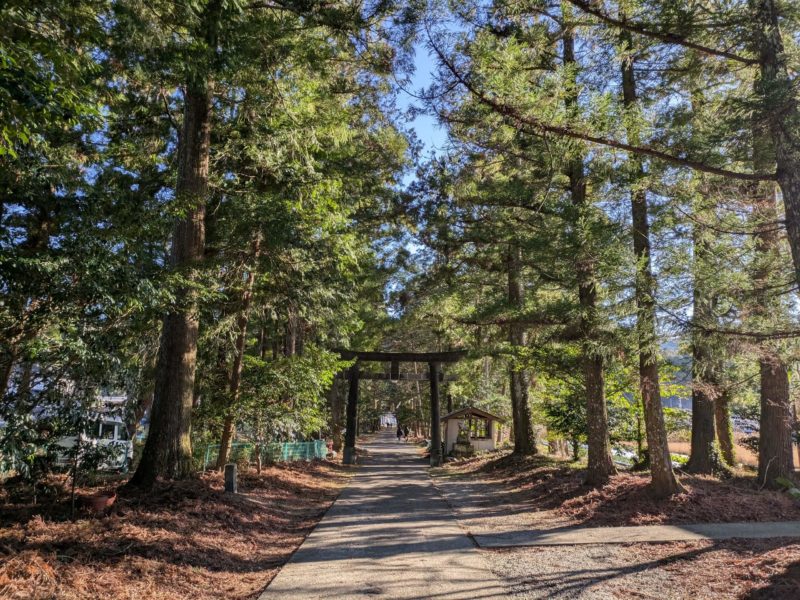 ながーい参道なのでここからは神社のお社はまだ見えていません、車はこの鳥居の手前に停めるスペースがあります。お正月は地元の食べ物屋台が出て温かい焼きたて茂平餅(五平餅の日高村バージョン)を売っていました
