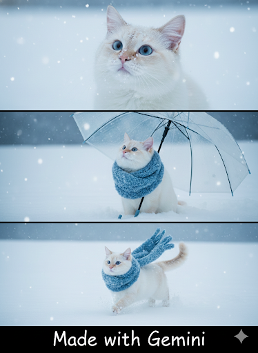 全ての画像は寒色系の淡い青と白を基調とし、服装が強いコントラストを生み出しています。光は柔らかく拡散しています。