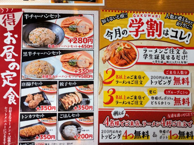 お昼のお得な定食セット、学生さんなら更にお得な学割もあるよ