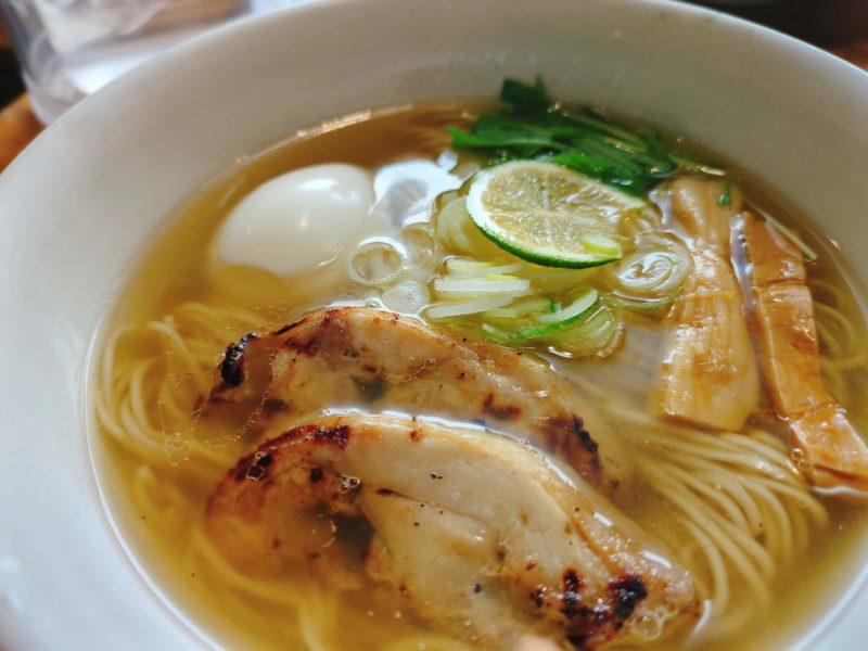 鶏肉チャーシューは分厚くて、香ばしい、食べ応えのある焼き鳥みたい、りょう花定番のスダチの薄切りと相性ばっちり