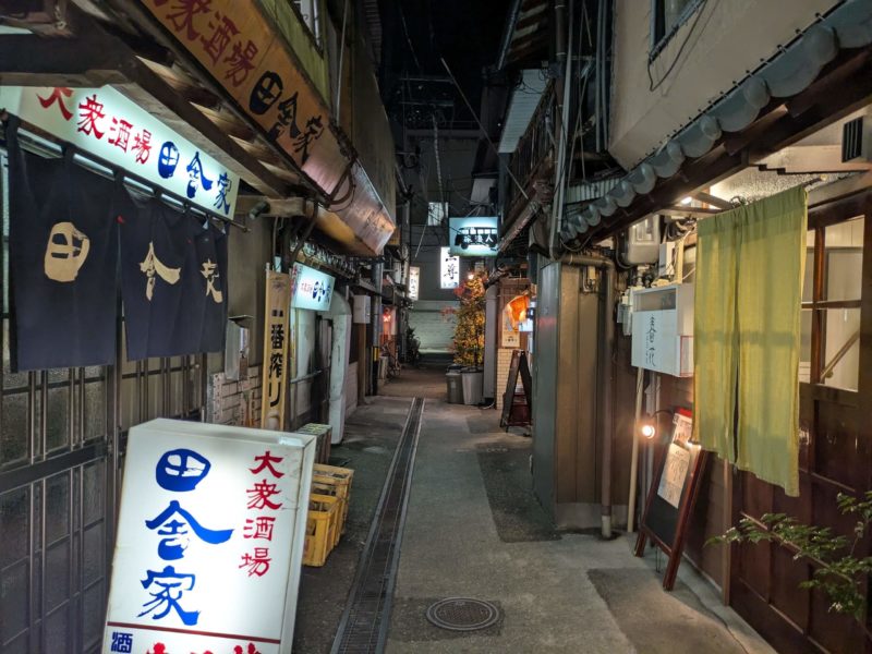 ラーメンしなとらを過ぎて、右手に入って行く小さな路地、ここが名店多い天神橋商店街の居酒屋小路