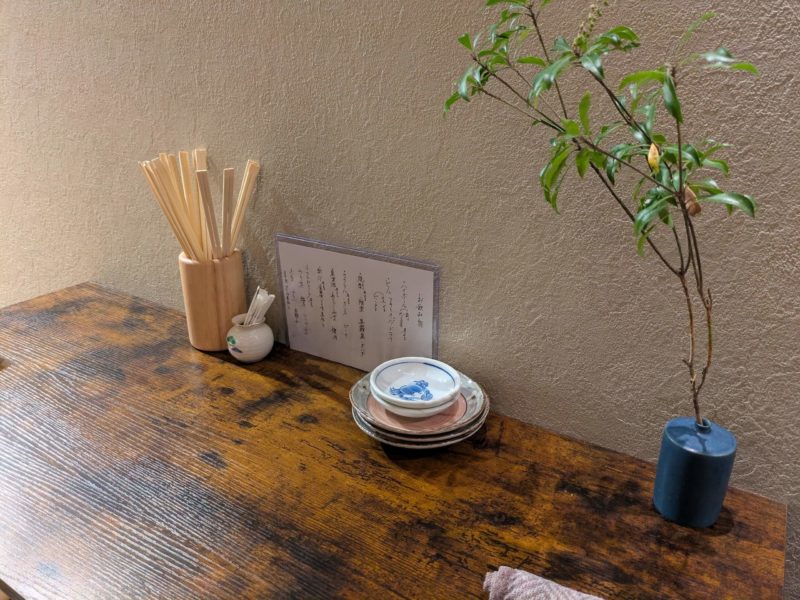 小さいお店だけど、いたるところに季節の山野草が活けてあって、木と白壁にマッチする温かみのある内装