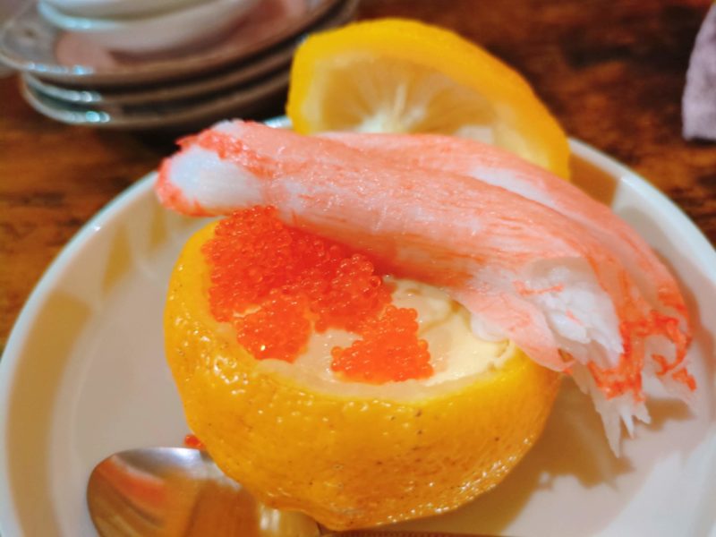 ゆずを器に柚子窯にした茶碗蒸し、キラキラのトビッコと大きなカニカマ