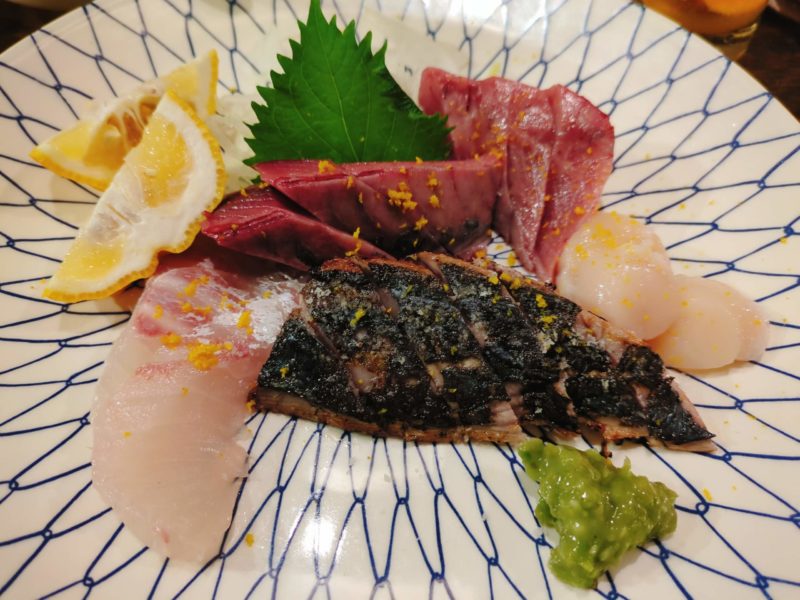 刺身盛り合わせを3人前でお願いしました、鯛、すまガツオの刺身とタタキ、まぐろ、ホタテ、