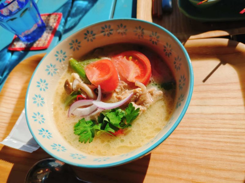 トム(煮る)カー(生姜)ガイ(鶏)、鶏出汁スープにまろやかココナッツミルク、柔らかい鶏肉もトッピングされてます