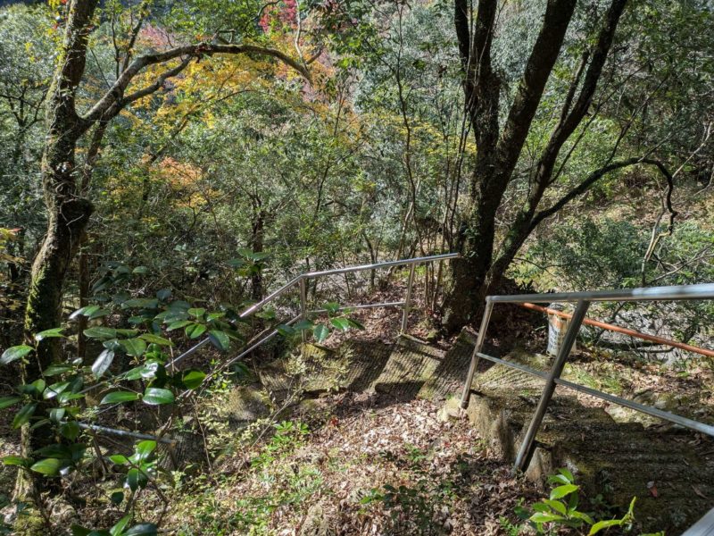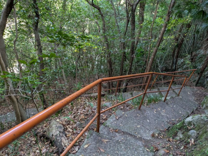 滝つぼへの道はかなり急な下り坂、舗装された階段と手すりが付いてるけどちょっとした山歩きです