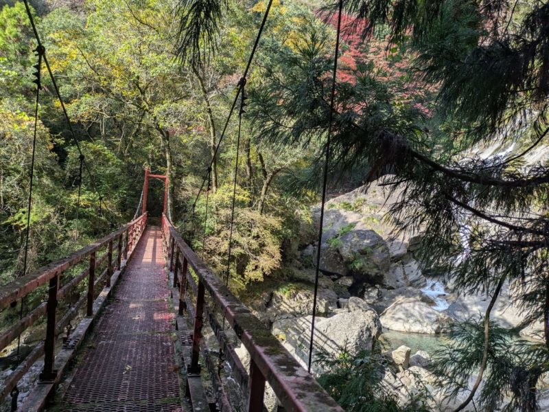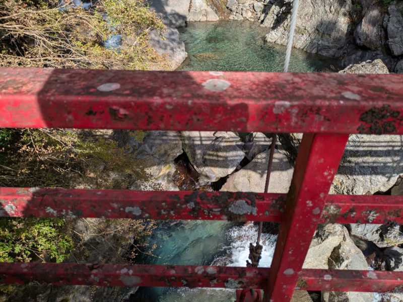なかなかに年季の入った赤いつり橋、歩くとちょっと揺れてスリリング