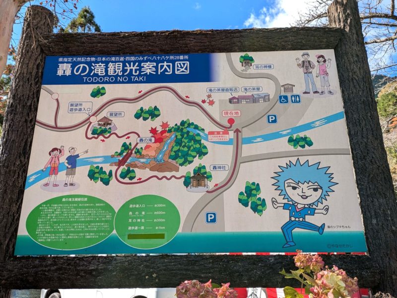 案内板には、やなせたかしさんのキャラクター「瀧のシブキちゃん」がいますよ、香美市はやなせ先生の故郷だもんね