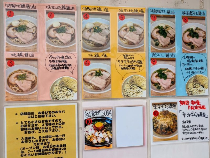 私が行った日曜12時半は前に2組並んでいたので、並びながら店前に貼ってあるメニュー見て心を決めて店内に入りました
