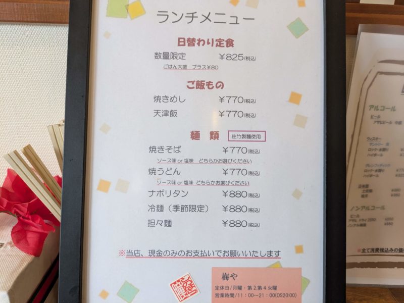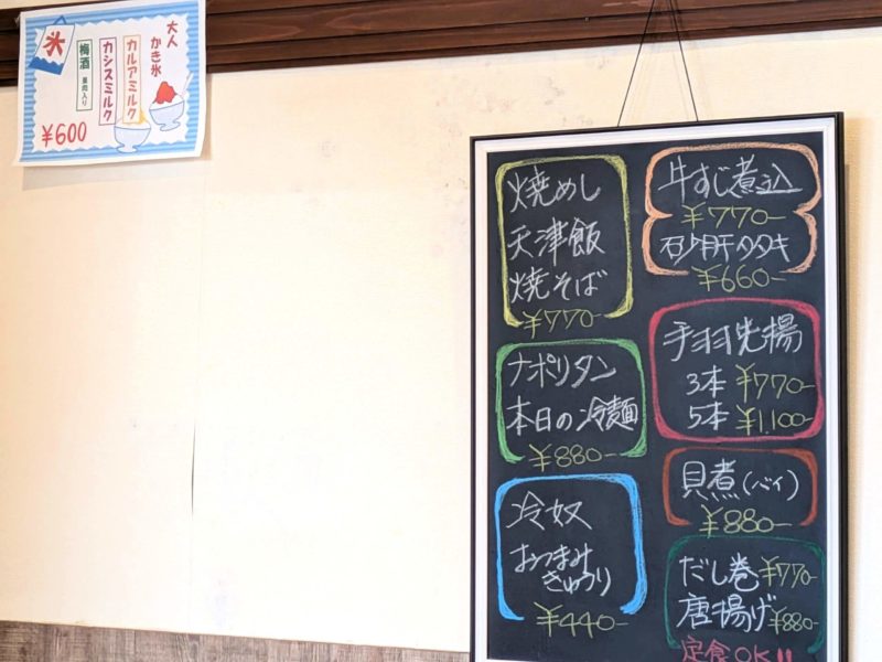 手書きのメニューもありました、焼き飯やナポリタンは夜も食べられるのね
