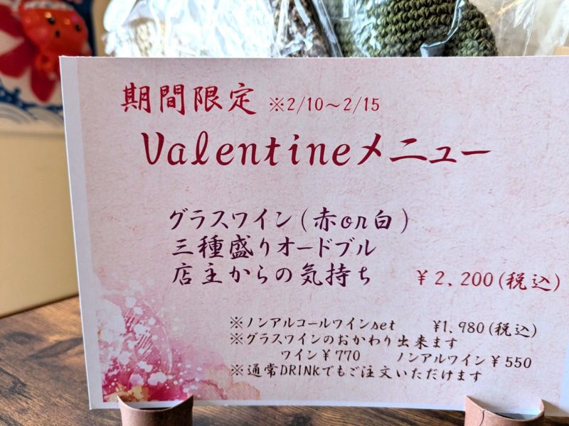 期間限定のバレンタインメニューがありました、グラスワインとオードブル、メインは「店主からの気持ち」2200円、いったい何が出るんだろう??