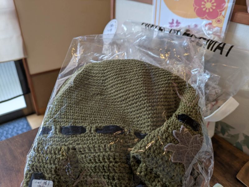 テーブルの上に乗った箱では手編みの帽子とストールが販売中